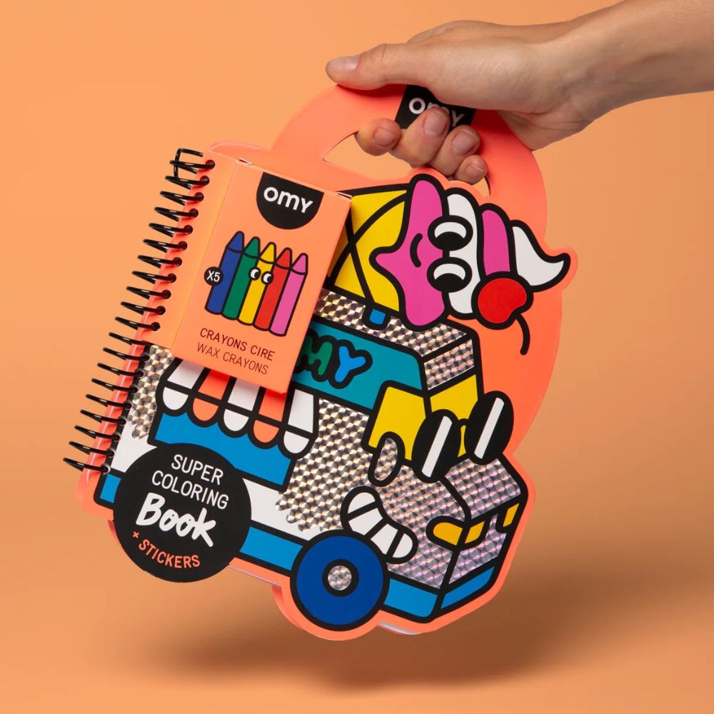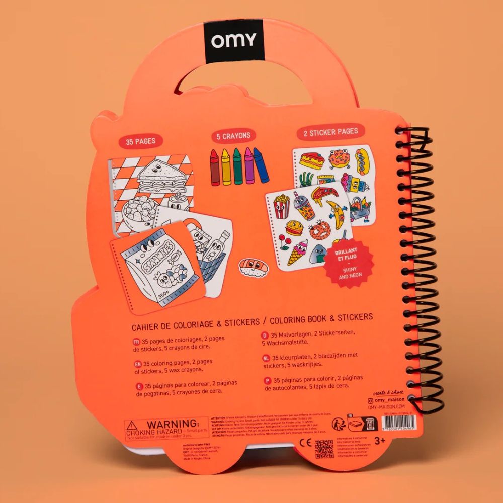 Zestaw został zaprojektowany z humorem i fantazją w paryskim studio OMY. Do kolorowanki dołączono 2 arkusze naklejek i 5 kolorowych kredek woskowych, idealnych dla małych rączek głodnych wyobraźni. To świetna alternatywa dla zabaw z ekranem – rozwija koncentrację, kreatywność i sprawność manualną, a przy tym zapewnia mnóstwo radości i śmiechu.