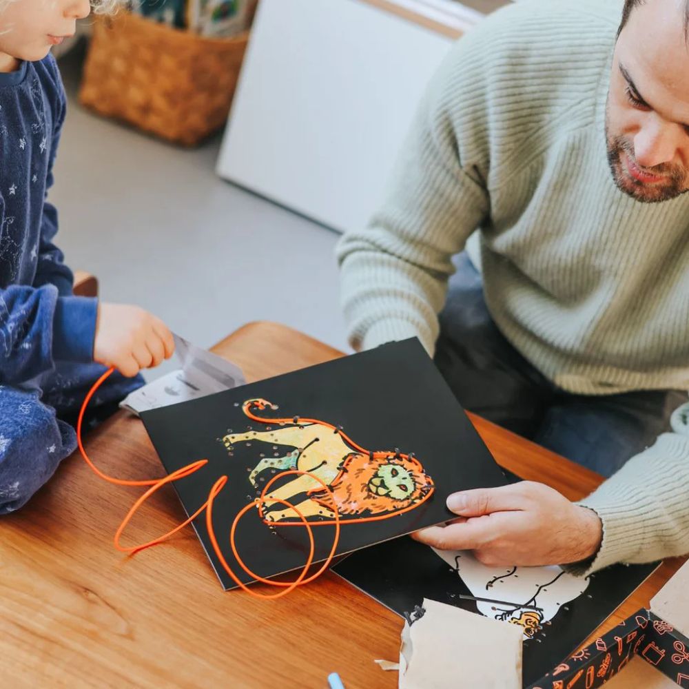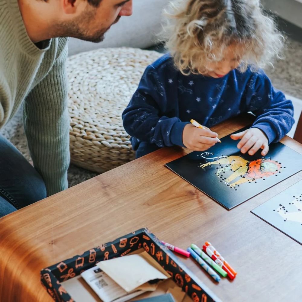 Wystarczy przełożyć kolorowy przewód przez perforowaną planszę, aby powstał efektowny, podświetlany wzór. Dzięki dołączonym do zestawu mazakom można samodzielnie pokolorować rysunek i nadać mu wyjątkowy charakter. To wciągająca zabawa bez ekranu, która rozwija motorykę małą, koncentrację i cierpliwość. Gotowe dzieło można umieścić w pudełku, które zamienia się w ramkę – idealną do wyeksponowania na półce lub biurku.