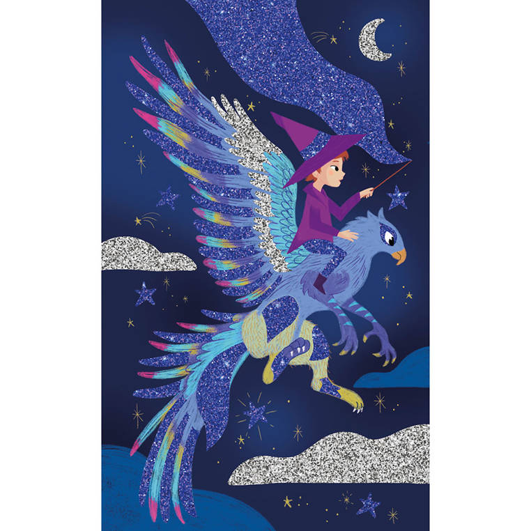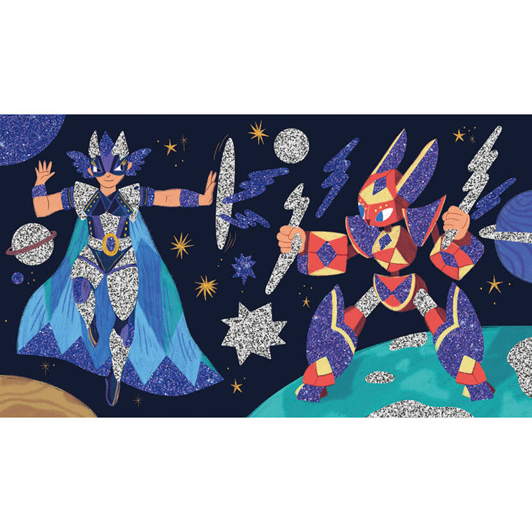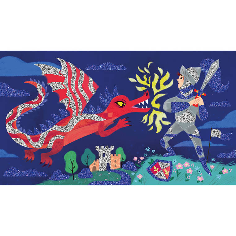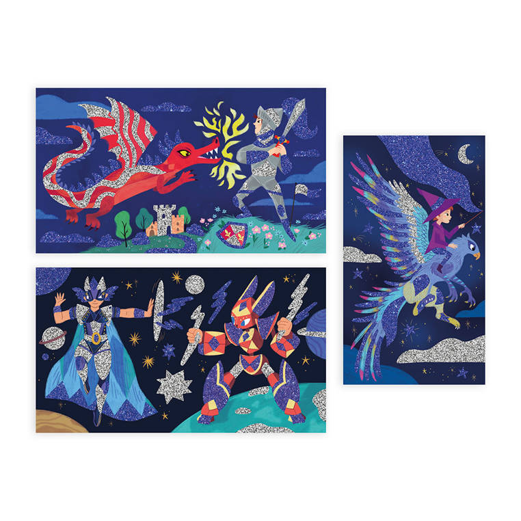 Zestaw kreatywny brokat Bohaterowie zawiera 3 plansze-obrazki z powłoką samoprzylepną, z dzielnymi bohaterami w akcji: kosmiczną walką herosów, czarodziejką na magicznym gryfie oraz rycerzem, stawiającym czoła zionącemu ogniem smokowi. Ilustracje te można – w wyznaczonych miejscach – posypać dołączonym do zestawu brokatem w tubkach, w 2 kolorach: srebrnym i granatowym. Brokat przykleja się do obrazków, pozostawiając na nich drobną strukturę. W komplecie znajduje się też szpatułka do odkrywania powierzchni, przeznaczonych do ozdabiania.