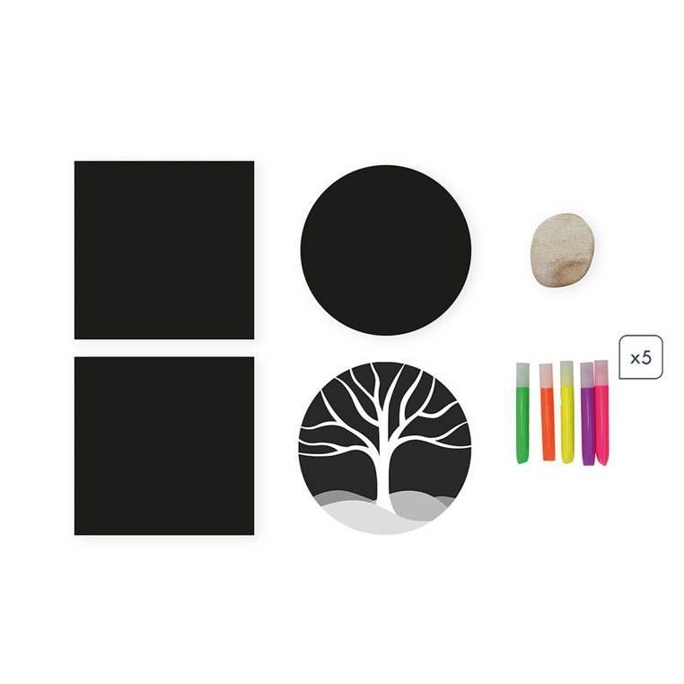 Zestaw kreatywny do malowania kropkami zawiera 5 projektów do wykonania – dwa kwadratowe obrazki z czarnym tłem, dwa okrągłe czarne obrazki (jeden z zarysem wzoru) oraz jeden płaski kamień do ozdobienia. W komplecie znajduje się 5 tubek z farbami w neonowych kolorach: fioletowym, różowym, pomarańczowym, żółtym i zielonym, ze specjalnymi końcówkami do robienia kropek. Ponadto sprytne opakowanie zestawu może stać się ramką 3D dla skończonego obrazka.