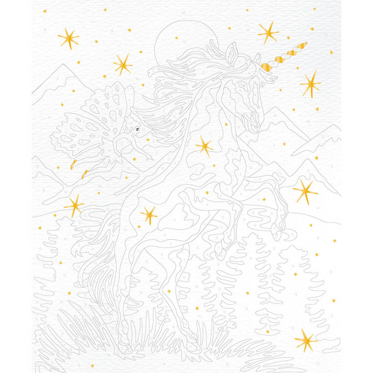 Zestaw kreatywny Malowanie po numerach Jednorożce marki JANOD zawiera 2 plansze-obrazki z tymi stworzeniami – portret z bliska i całą sylwetkę podczas nocnej wyprawy po magicznej krainie. Plansze są białe (jedna ma wyróżnione złote elementy), podzielone na ponumerowane przestrzenie o nieregularnych kształtach, a ilustracja ujawnia się na nich dopiero w trakcie malowania. Zadanie polega na precyzyjnym – za pomocą dołączonego specjalnego cienkiego pędzelka ze zbiornikiem wody – wypełnieniu trójkątów farbą, zgodnie z instrukcją numeryczną. W palecie akwareli znajduje się 15 kolorów i mała gąbka do pochłaniania nadmiaru wody. W komplecie jest też ramka na skończony obrazek, którą również można pomalować na wybrany kolor. Malowanie po numerach to dla dziecka godziny angażującej i jednocześnie uspokajającej, wyciszającej zabawy, a gotowe obrazki staną się wspaniałą dekoracją dziecięcego pokoju.