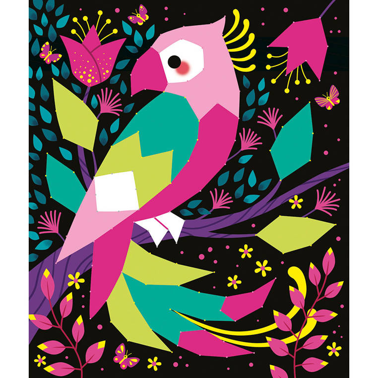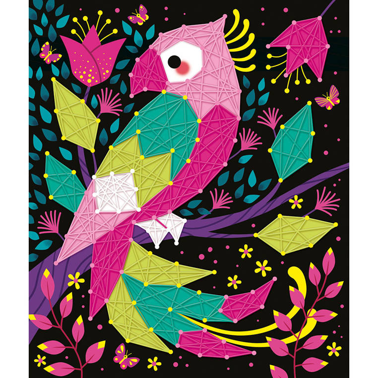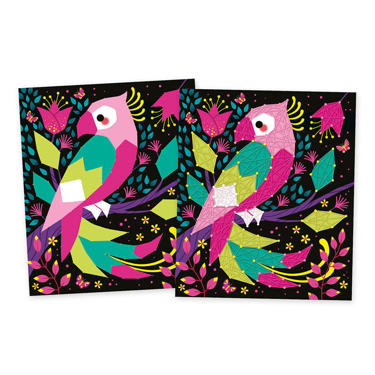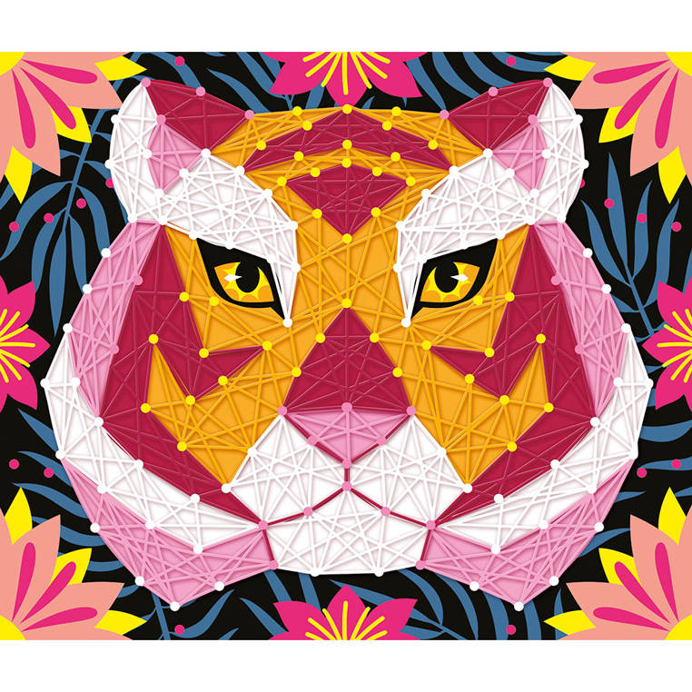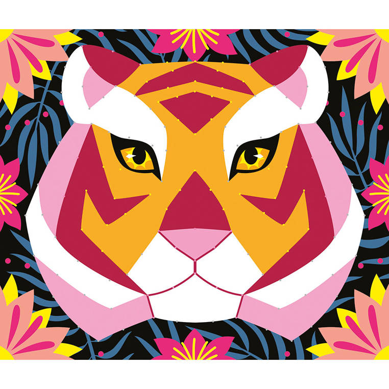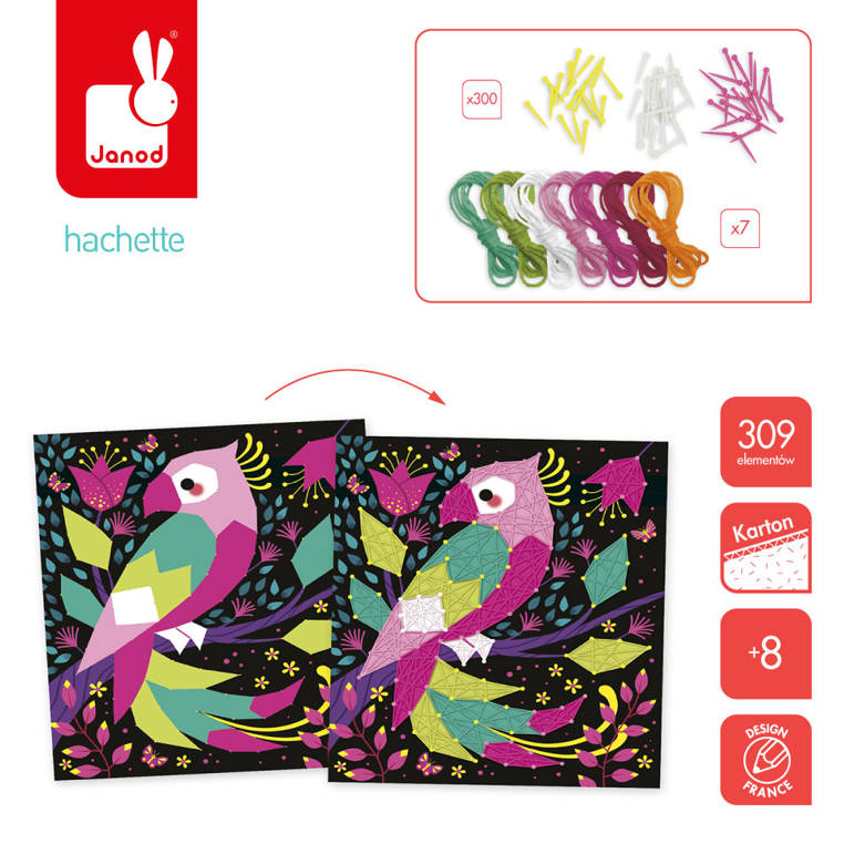 Zestaw kreatywny Przeplatanka 3D String art Zwierzęta dżungli francuskiej marki JANOD zawiera 2 plansze z grubej pianki z grafikami dzikich zwierząt: papugi i tygrysa z neonowymi elementami i neonowym brzegiem, 300 bezpiecznych gwoździków z tworzywa w 3 kolorach, które należy wbić i wcisnąć w zaznaczone na planszach punkty, 7 kolorowych motków muliny do przeplatania wokół nich, zgodnie z załączoną szczegółową instrukcją. String art to bardzo ciekawa technika nawlekania kolorowych nici między punktami, tworzących abstrakcyjne geometryczne wzory. Jest to praca przestrzenna, a jej efekty są zachwycające. Powstaną w ten sposób niebanalne sznurkowe obrazy. Przelatanie czy nawet samo wbijanie drobnych gwoździków, to dla dziecka długie godziny angażującej i jednocześnie uspokajającej zabawy, a gotowe dzieła staną się powodem do dumy i wspaniałym elementem dekoracyjnym dziecięcego pokoju.
