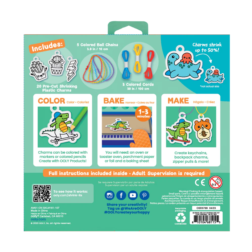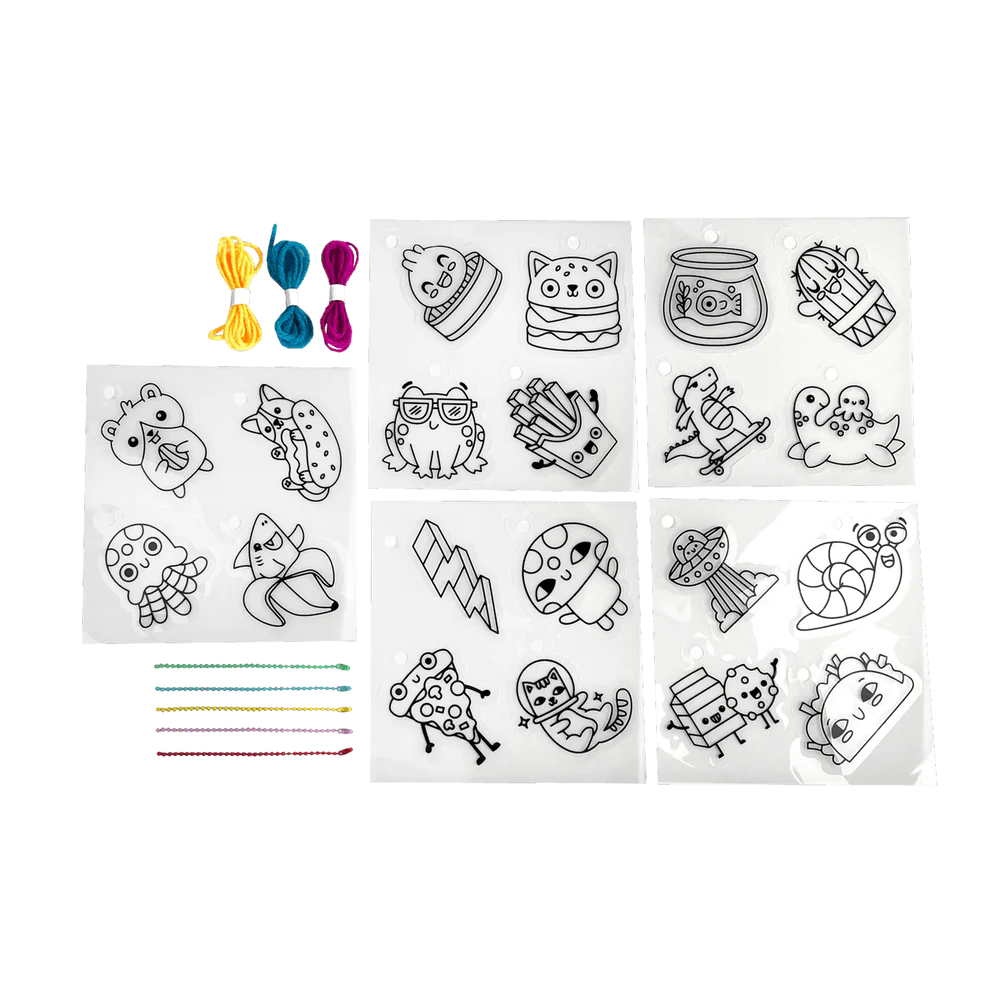 Zestaw kreatywny zawiera 20 breloczków do samodzielnego pokolorowania, trzy różnokolorowe sznurki i pięć różnokolorowych łańcuszków kulkowych. Wystarczy zaopatrzyć się w ulubione flamastry lub kredki i dostęp do piekarnika, w którym pod wpływem wysokiej temperatury utrwalisz swoją pracę (oczywiście pod opieką osoby dorosłej!). Wykonane z lekkiego plastiku zawieszki łatwo się kolorują, a po „obkurczeniu” ich w piekarniku idealnie nadają się do zawieszenia na plecaku lub torebce!
