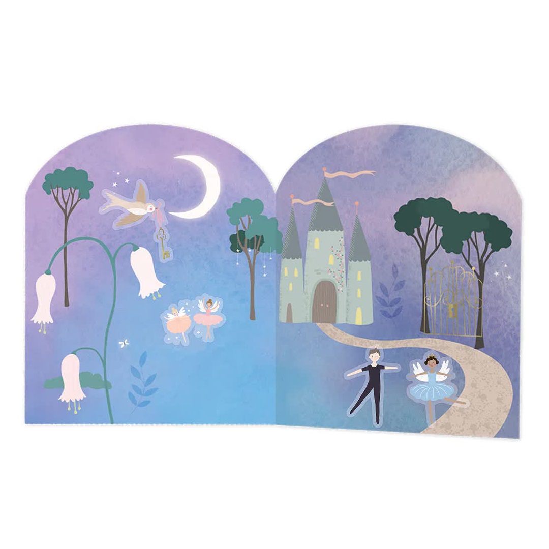 Zestaw naklejek wielokrotnego użytku z planszami Baletnice to świetna zabawa i nauka jednocześnie. W skład zestawu wchodzi ponad 50 zabawnych, kolorowych naklejek, w tym baletnice, uśmiechnięty księżyc, kolorowe ptaki, króliki, owady, magiczne przedmioty i wile innych oraz 2 rozkładane plansze ilustrujące zamek na wzgórzu i scenę w magicznym lesie do tworzenia i wymyślania historii za pomocą naklejek. Naklejki można łatwo umieszczać, nakładać na siebie i zmieniać ich położenie. Dodatkową zabawą jest dopasowywanie naklejek do ich kształtów na kartach do ich przechowywania. To zapewni maluchom rozrywkę na długie godziny! Zestaw daje dzieciom nieograniczone możliwości wyrażania swojej kreatywności, ponadto ćwiczy koncentrację i wyobraźnię, jak i rozwija małą motorykę. Zestaw zapakowany jest w twardą okładkę, składa się całkowicie na płasko, dzięki czemu idealnie sprawdzi się w podróży.