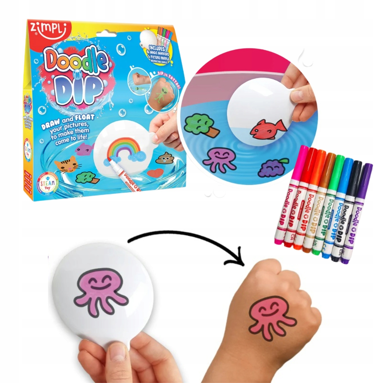 Niesamowite studio tatuażu dla dziewczynek i chłopców! Powiedzenie, że coś jest palcem na wodzie pisane nabiera w tym przypadku zupełnie nowego znaczenia! To niezwykły zestaw do tworzenia obrazków własnego pomysłu za pomocą ośmiu kolorowych markerów. Po namalowaniu ich na specjalnej podstawce, wystarczy je zanurzyć w wodzie i są już gotowe do przyklejenia na skórze.