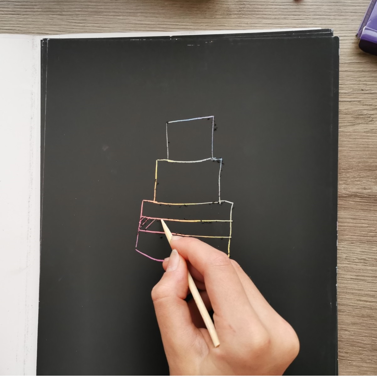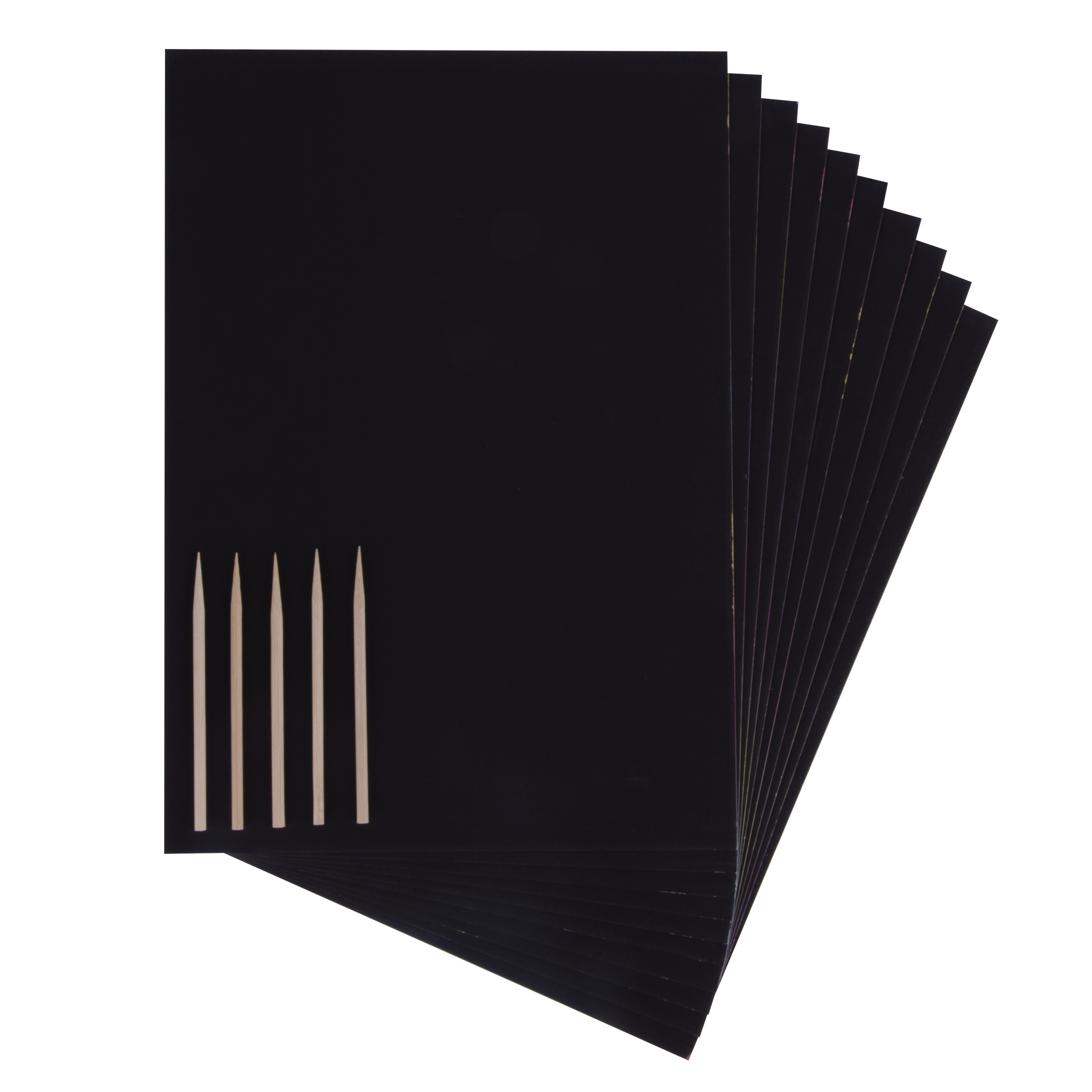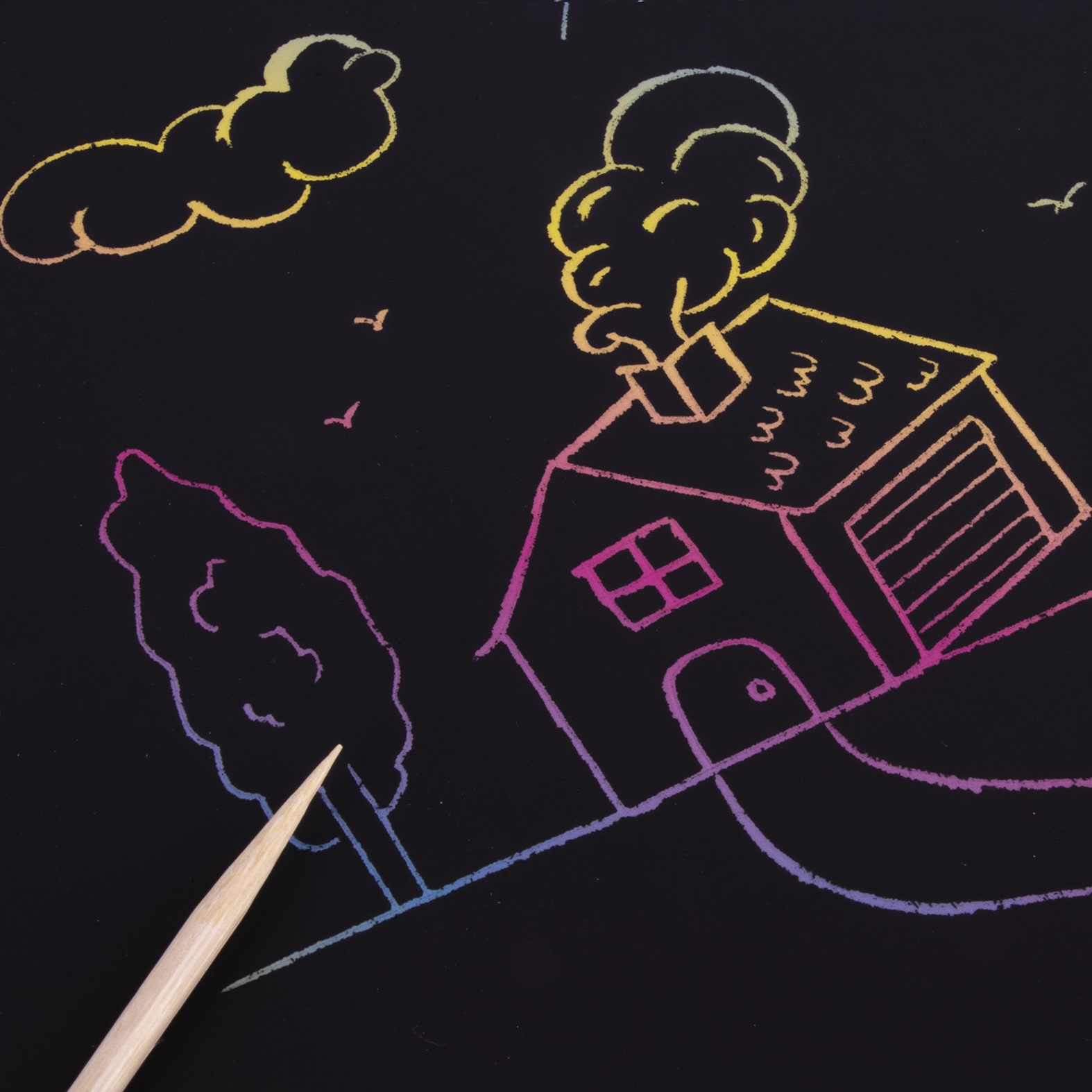 Zawiera 10 arkuszy w formacie A4 oraz 5 patyczków do scratchowania, co pozwala na wydrapywanie rysunków na czarnej planszy, a następnie odkrywanie kolorów tęczy spod spodu. Zestaw ten jest idealny do użytku w domu, ale także polecany jest do szkół lub na zajęcia artystyczne. Zabawa w wydrapywanie to świetna forma spędzania czasu i rozwijania umiejętności manualnych u dzieci.