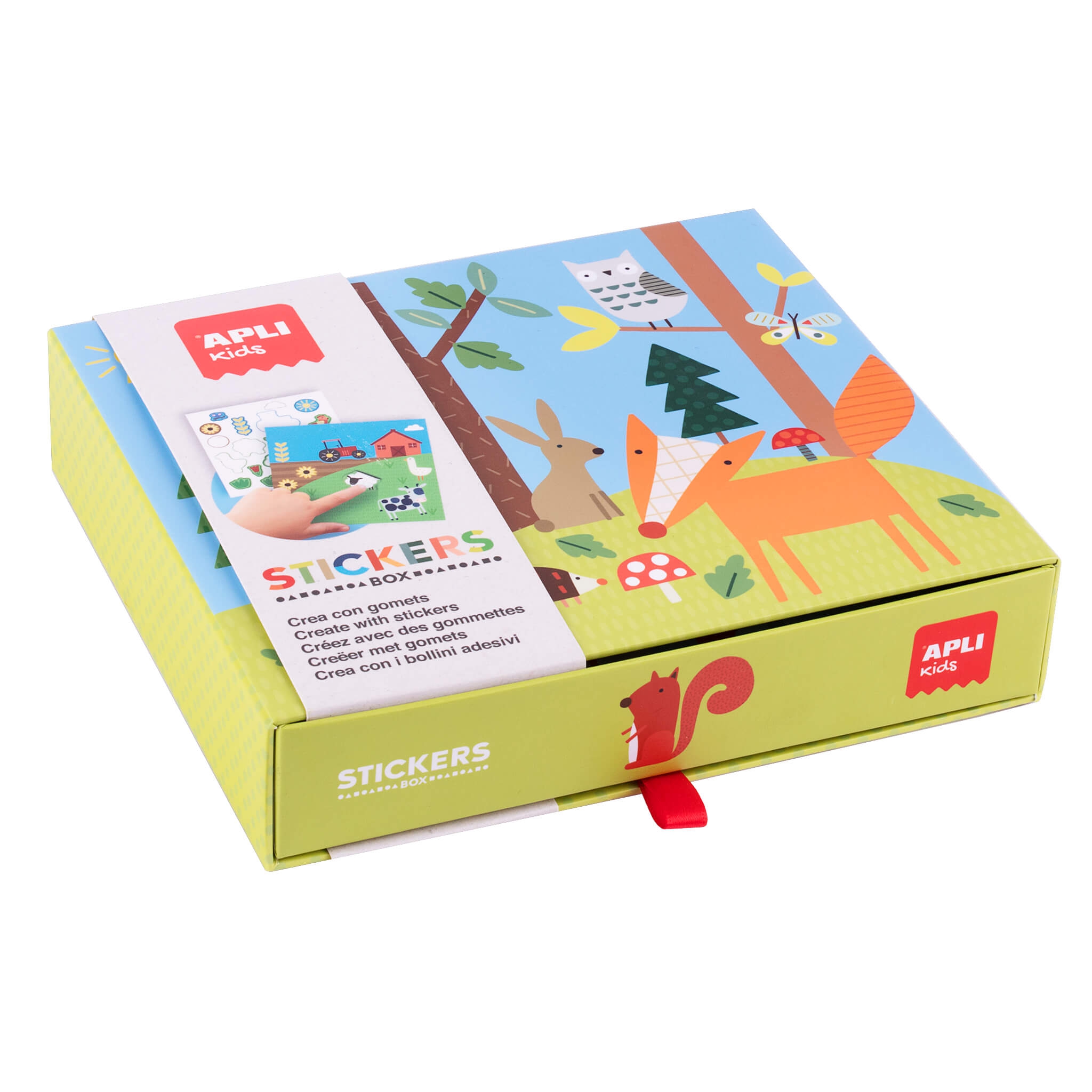 Zestaw z naklejkami z leśnym motywem marki Apli Kids. Zabawa polega na uzupełnieniu arkuszy odpowiednimi naklejkami, pasującymi do przedstawionej ilustracji. Dziecko w razie pomyłki może odkleić naklejkę i przykleić ją w inne miejsce.