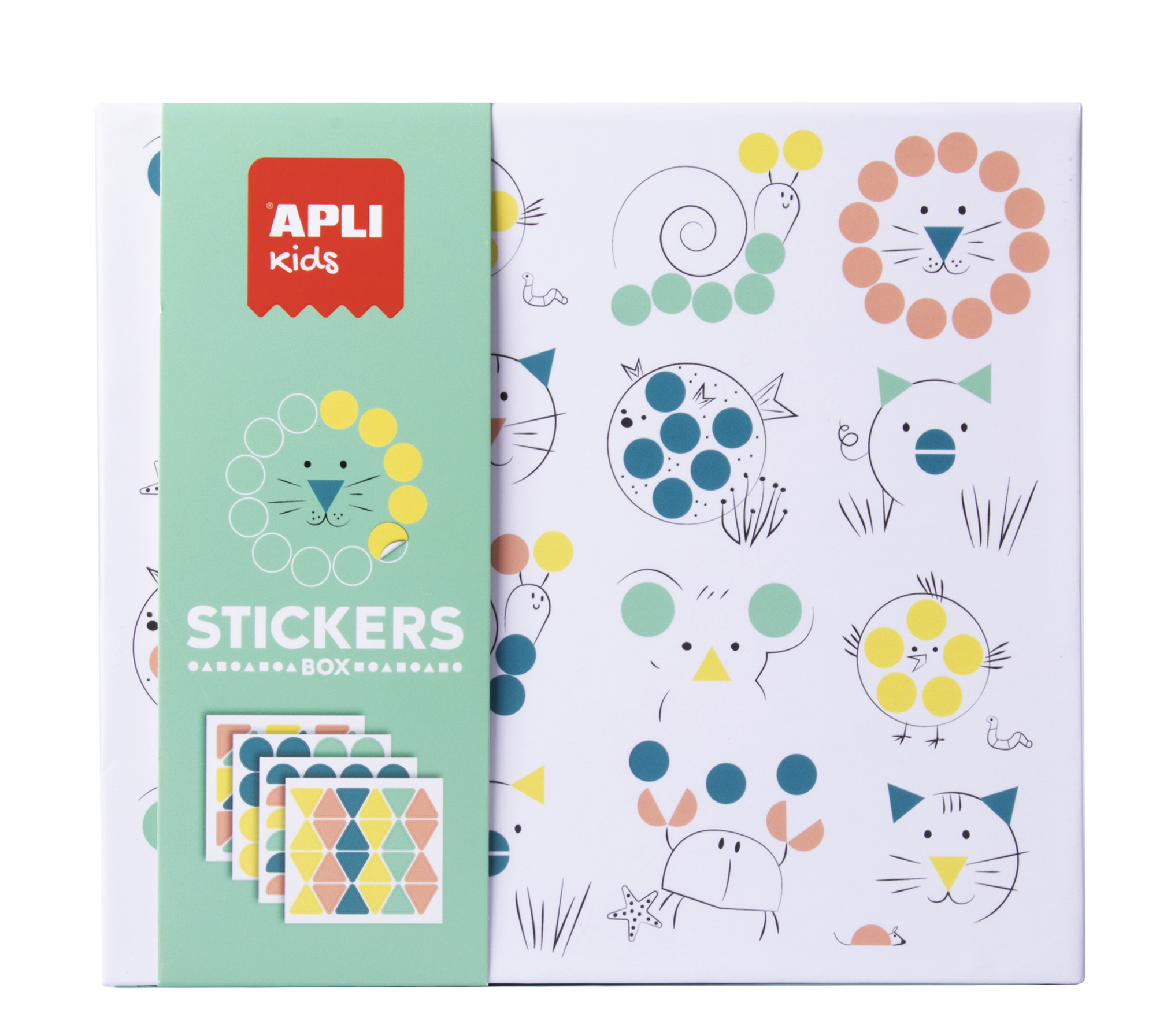 Zestaw z geometrycznymi naklejkami w kartonowym pudełku Apli Kids. Celem zabawy jest uzupełnienie plansz ze zwierzątkami różnymi naklejkami geometrycznymi. Naklejki są wielokrotnego użytku, dzięki czemu dziecko może je odkleić w razie pomyłki. Zestaw został opracowany przy wsparciu pedagogów i posiada wartości dydaktyczne: stymuluje zdolności motoryczne, rozwija myślenie matematyczne, pomaga w koncentracji, działa na koordynację ręka-oko oraz rozwija orientację przestrzenną. Kompaktowe opakowanie sprawia, że zestaw świetnie sprawdzi się w podróży.