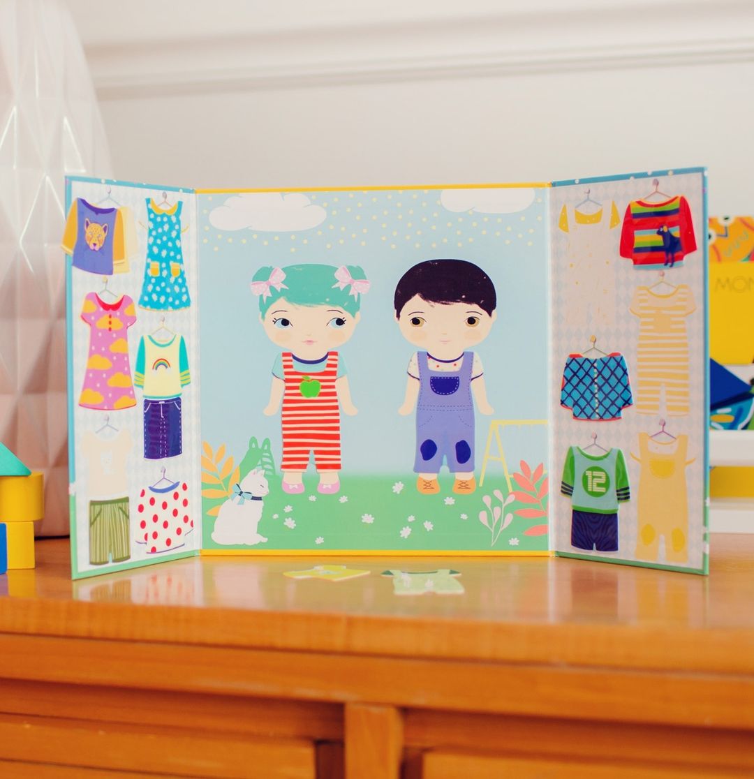 Kolorowy zestaw naklejek wielokrotnego użytku, z planszą w kształcie książeczki (podwójne strony, po rozłożeniu 43 cm). Grafika przedstawia dziewczynkę i chłopca. Maluch ma za zadanie ubrać postaci za pomocą dołączonych naklejek-ubrań. Zestaw różnych części garderoby pozwala na własne kompozycje. Naklejki łatwo się przyklejają oraz odklejają, dzięki temu można dowolnie zmieniać kreacje. Zabawa z zestawem naklejek to świetne ćwiczenie umiejętności z zakresu małej motoryki. Dziecko poznaje też części swojego ubioru, uczy się je nazywać i oswaja z czynnością ubierania i rozbierania. Zestaw z naklejkami wielokrotnego użytku Djeco Ubrania doskonale sprawdzi się jako zabawka na podróż.