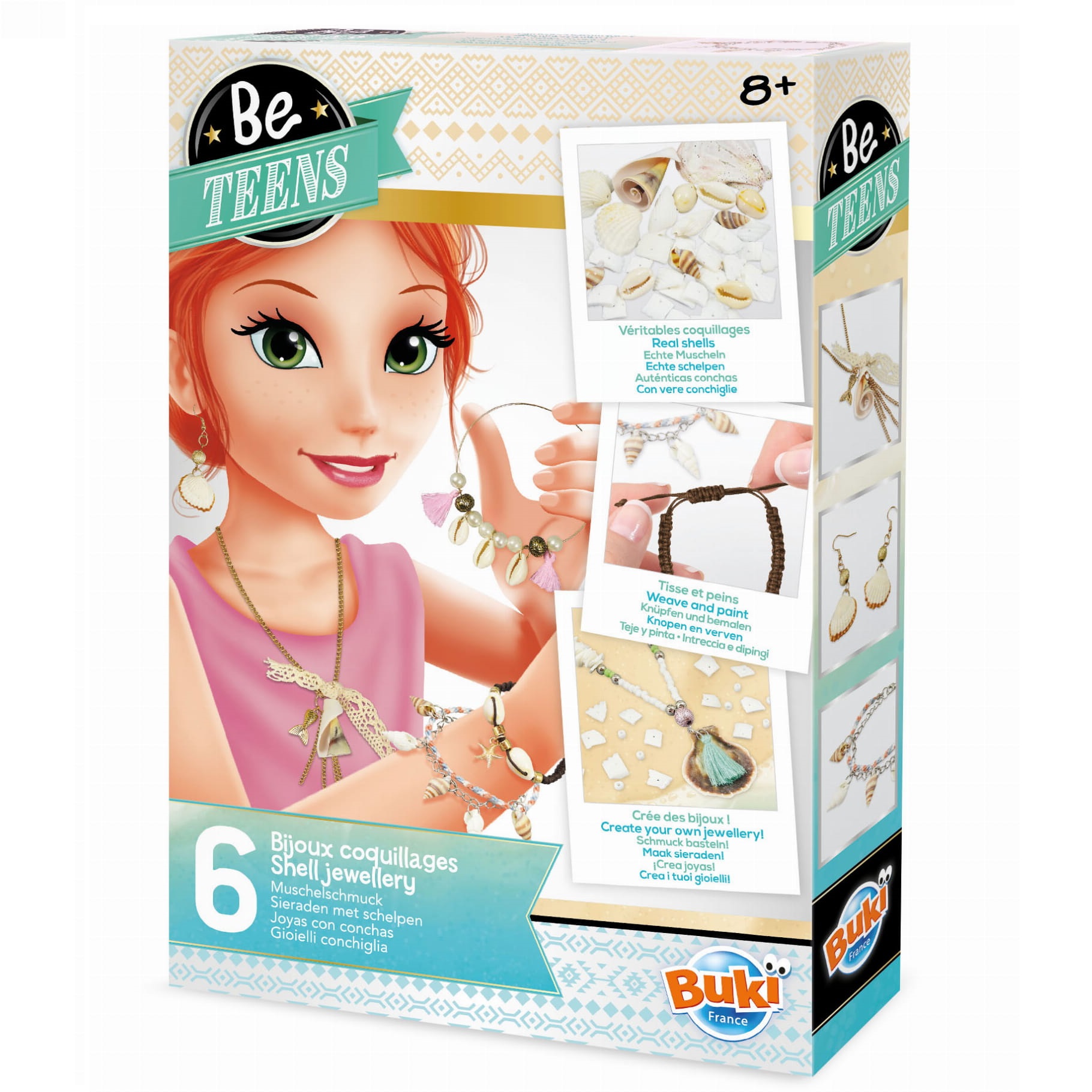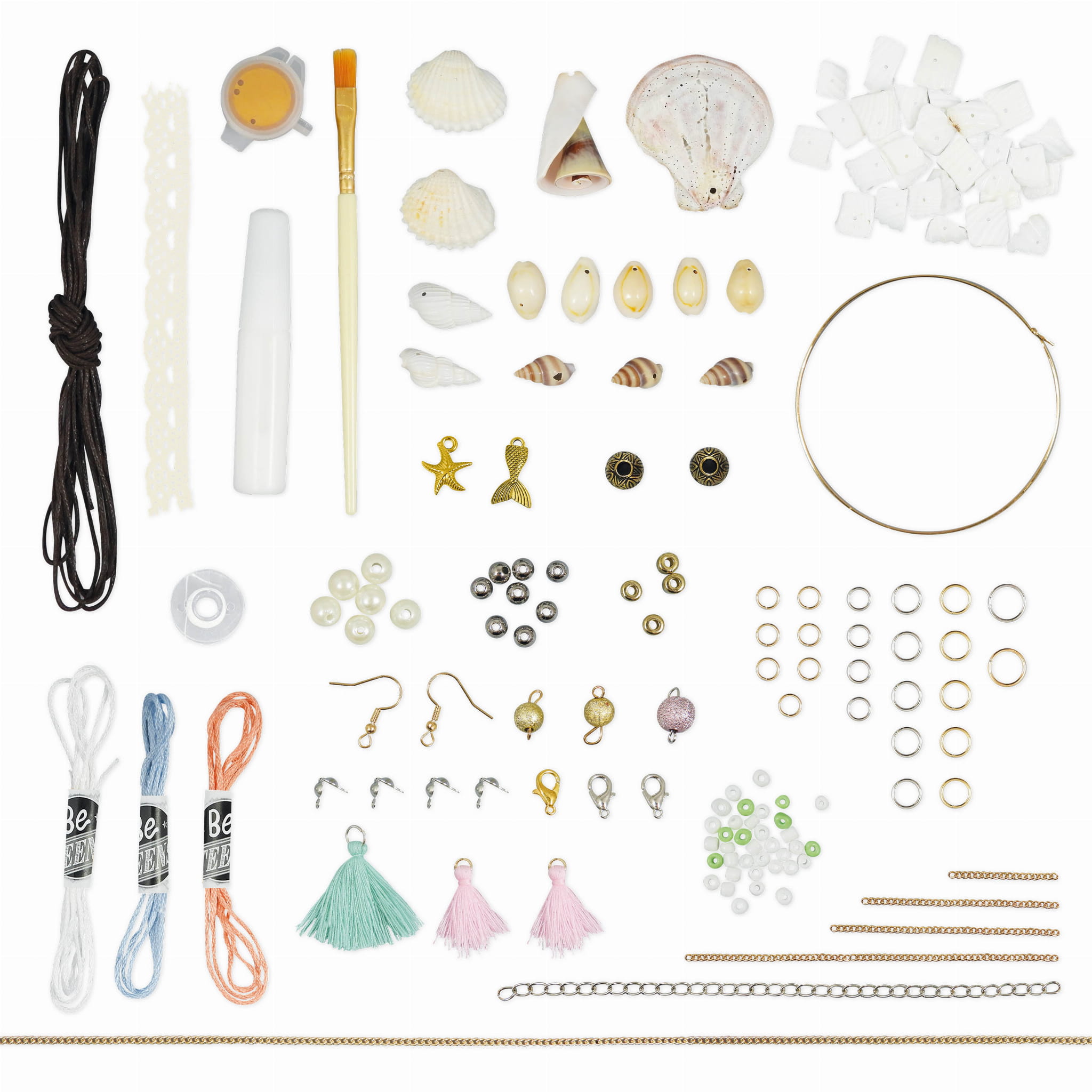 W zestawie: mulina w 3 kolorach, kolorowe, ozdobne chwosty, woskowany sznurek, koraliki, bigle, zawieszki, muszelki w różnych kształtach, koronkowa wstążka, złota farba, pędzelek, tubka kleju, 1 złota bransoletka, łańcuszki w kolorze złotym i srebrnym, instrukcja krok po kroku.