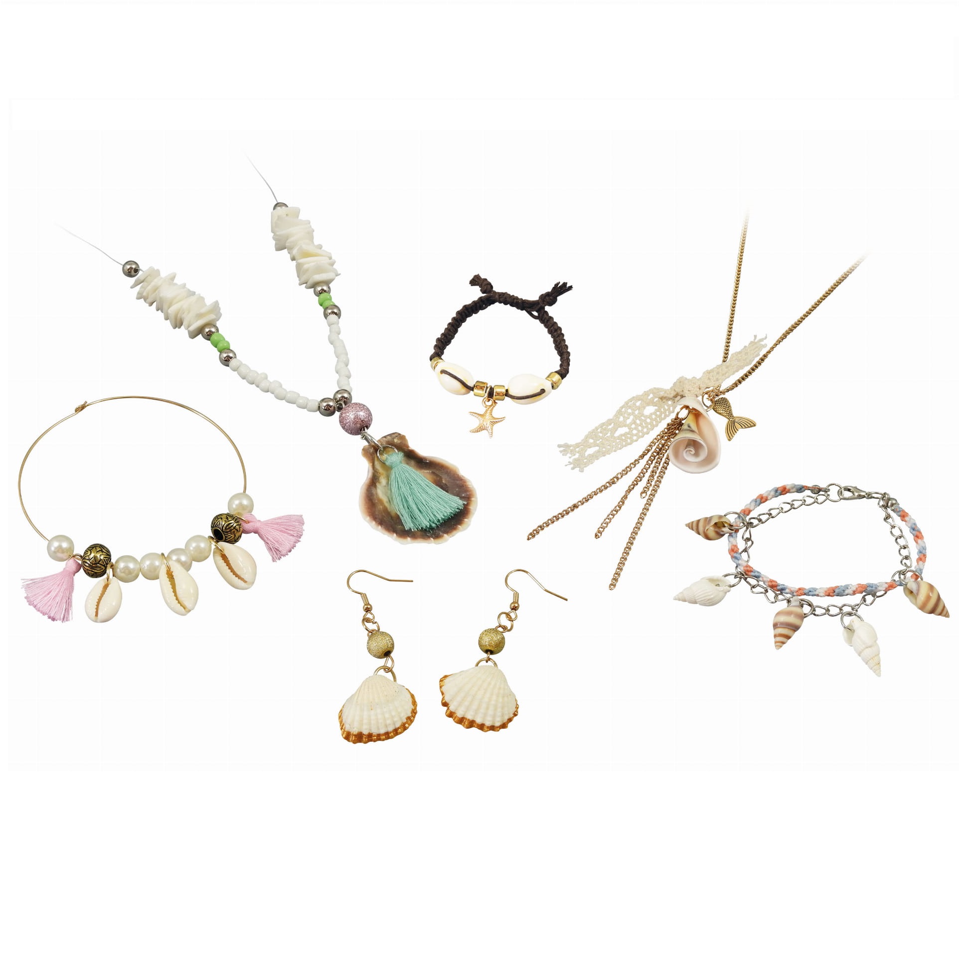 Nawlecz na kolorową mulinę koraliki, muszelki i inne dodatki, dodaj złotą farbę i stwórz 6 sztuk biżuterii z muszelek. Akcesoria wystarczą do stworzenia 2 naszyjników, 3 bransoletek i 1 pary kolczyków.