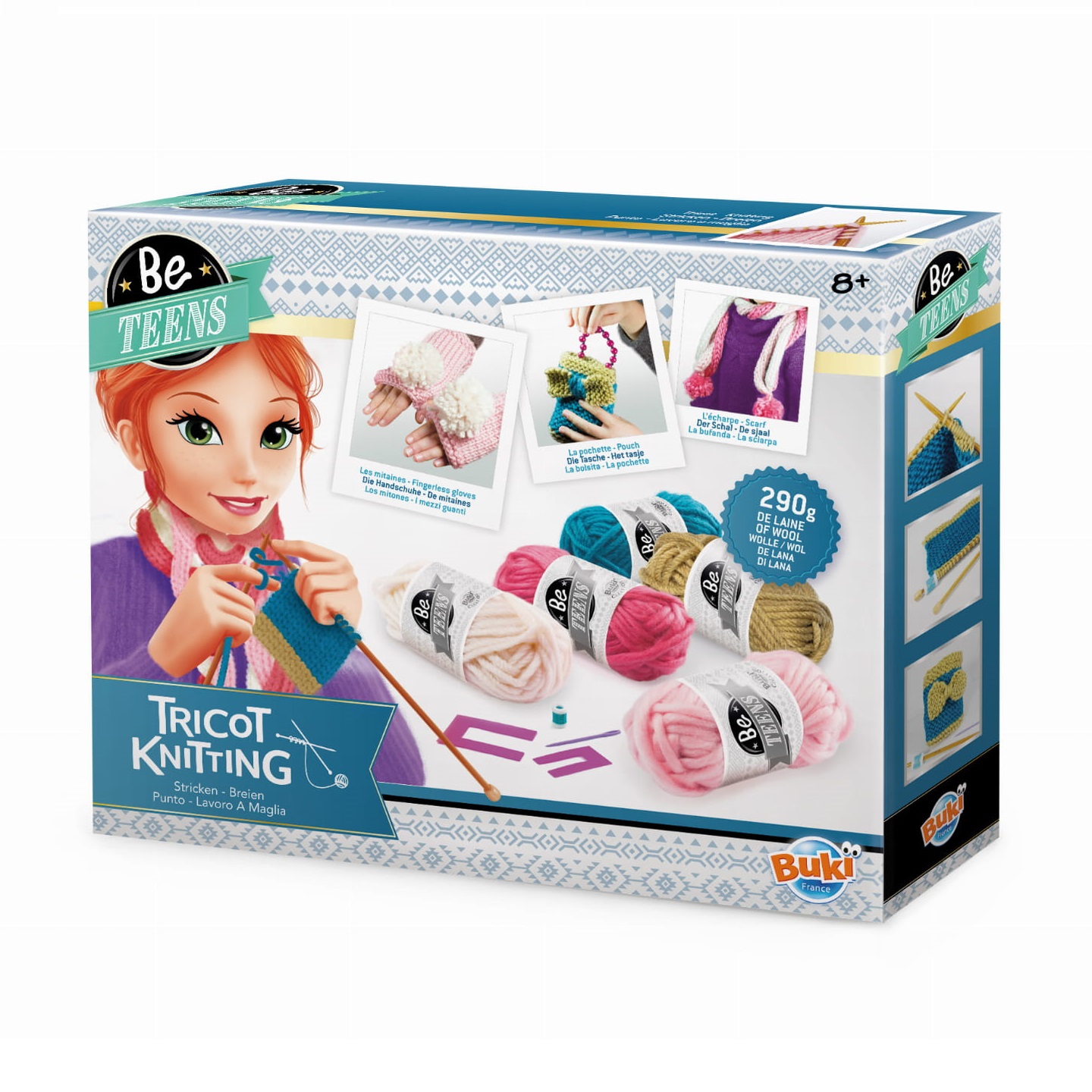 Zestaw do nauki robienia na drutach Buki - nauczysz się jak zrobić szalik, woreczek i rękawiczki bez palców (mitenki). Zestaw obejmuje naukę robienia na palcach dłoni, robienie na drutach za zmianą koloru oraz naukę podstawowego ściegu dżersejowego (pończoszniczego).