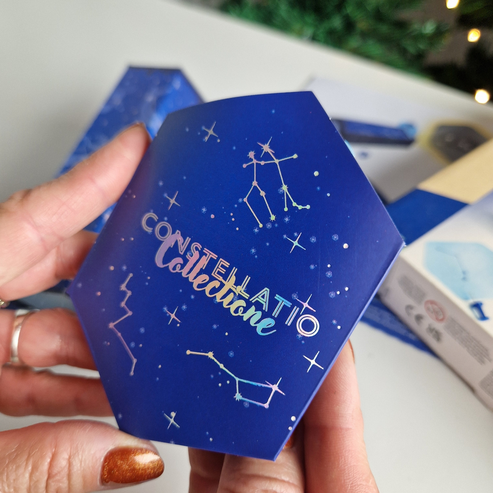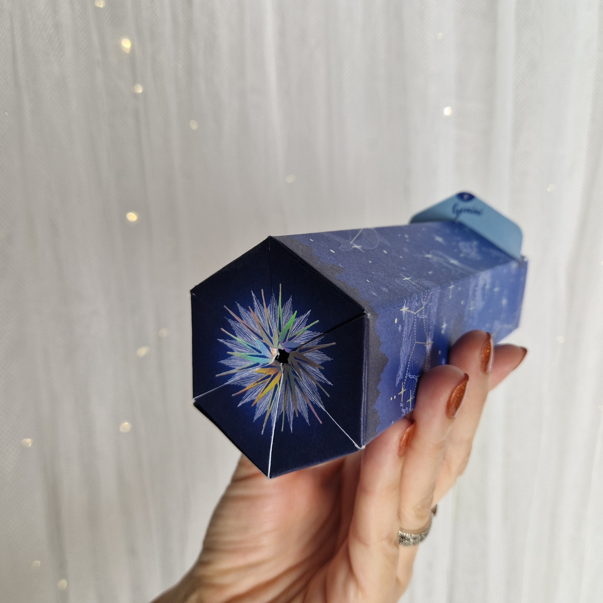Zestaw Zrób to sam KONSTELACJE to zadanie polegające na złożeniu projektora, do którego wkłada się karty z konstelacjami, wcześniej odpowiednio przygotowane. Znajdują się na nich obrazki symbolizujące poszczególne gwiazdozbiory. Za pomocą załączonej pinezki należy zrobić dziurki w oznaczonych miejscach, aby odkryć ukryte w nich konstelacje. Patrząc przez drugi koniec projektora, ujrzymy światło przebijające się przez przygotowane dziurki, imitujące świecące gwiazdki.
