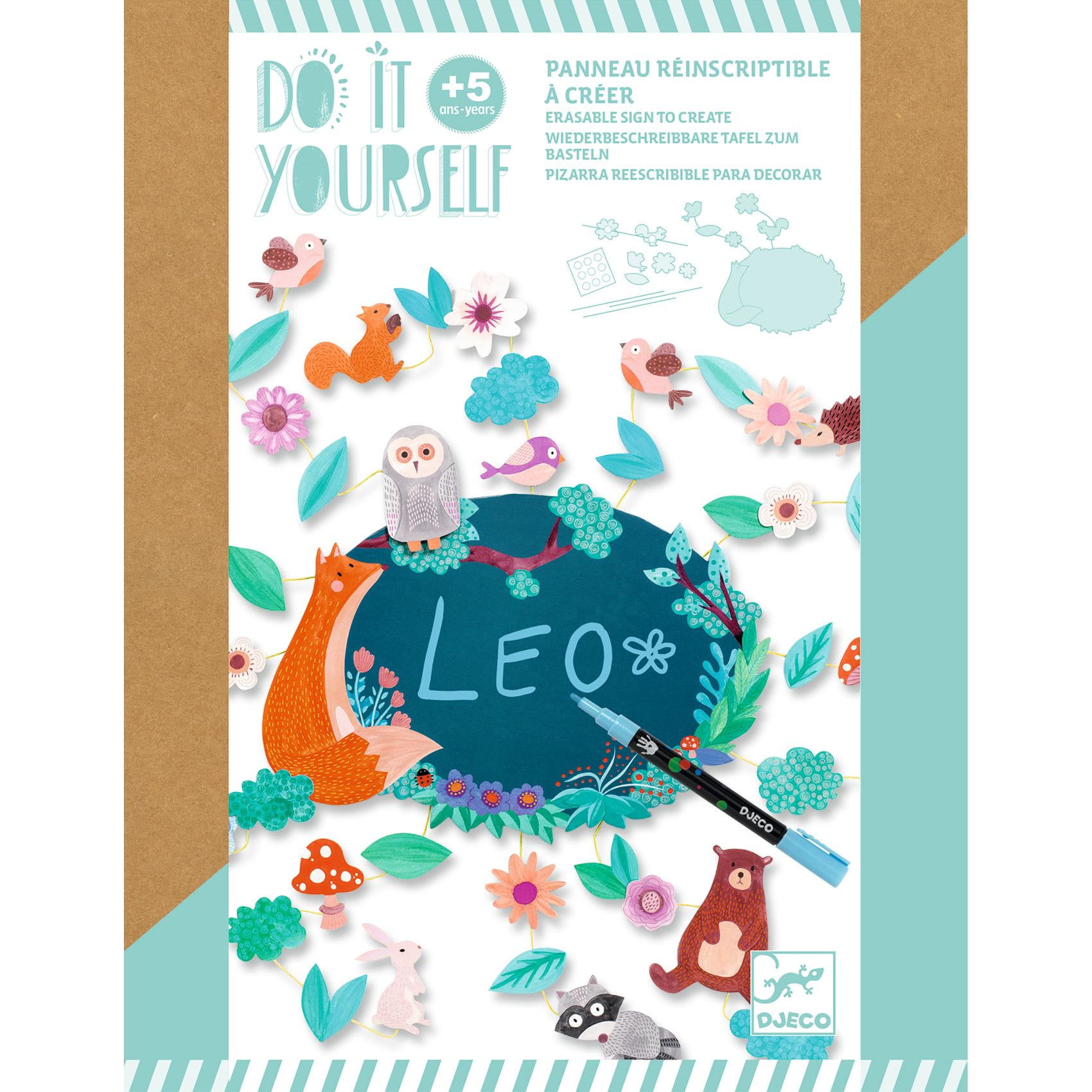 Zestaw artystyczny z serii Zrób to sam do samodzielnego stworzenia ścieralnej tablicy do zapisków ozdobionej uroczą ramką z motywem leśnym. Ilustracje należy przykleić na półsztywne druciki za pomocą piankowych naklejek i udekorować tabliczkę. Piękna i praktyczna ozdoba dzięcięcego pokoju. Zmywalny mazak i ściereczka są zawarte w zestawie. Powierzchnia tabliczki jest zabezpieczona przed zarysowaniem. Instrukcja krok po kroku ułatwi zadanie. Zestaw wykonany jest z papieru i kartonu posiadającego certyfikat FSC®.
