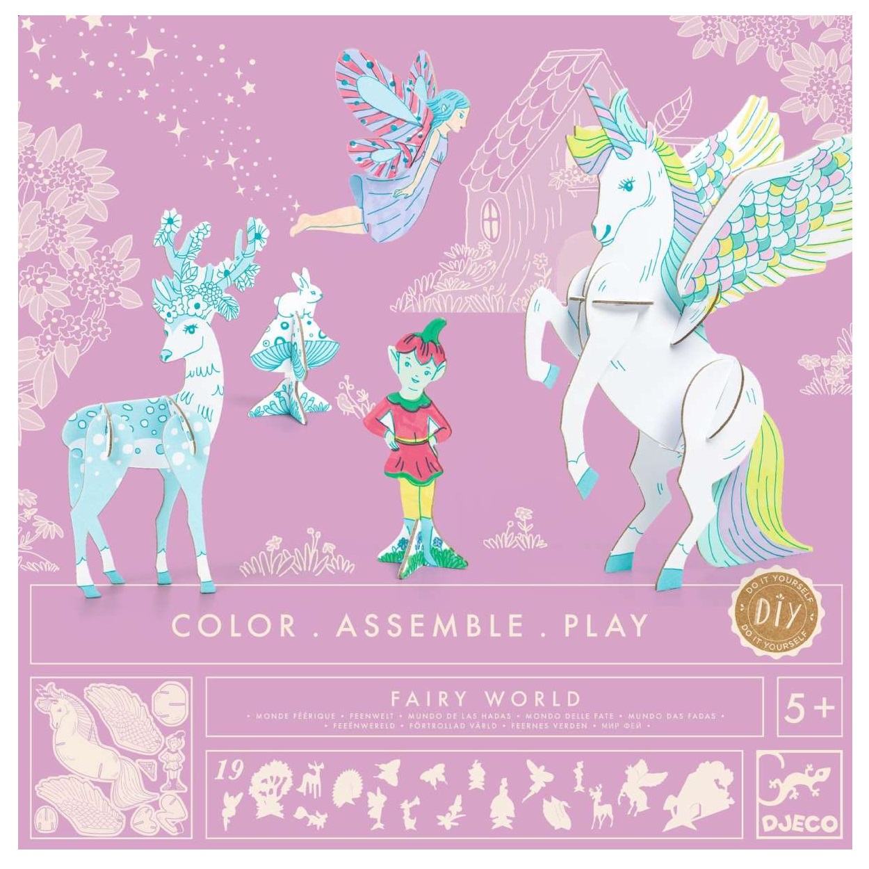 Zestaw kreatywny składający się z kartonowych elementów do pokolorowania i złożenia. Po wykonaniu opisanych aktywności otrzymamy komplet 19 czarujących postaci z magicznego świata wróżek. Wcześniej wycięte kartonowe elementy są skonstruowane w taki sposób, aby montaż nie wymagał nożyczek i kleju.