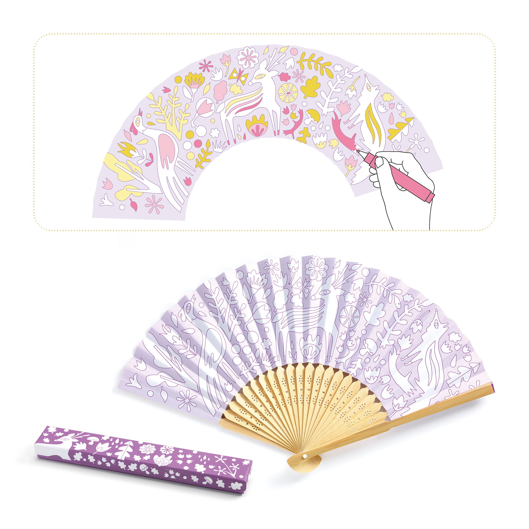 Zestaw do samodzielnego pokolorowania wachlarza oraz etui do jego przechowywania.